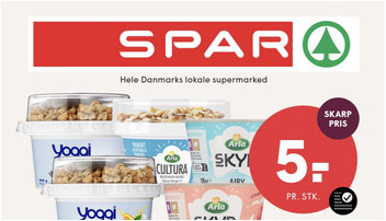 Spar tilbyder flere varianter af Arla Airy, Yoggi med Top eller Cultura med Top til en skarp pris på kun 5 kr. pr. stk. Vægten varierer mellem 128-170 g, og tilbuddet gælder fra tirsdag den 7. april til og med torsdag den 9. april 2026.