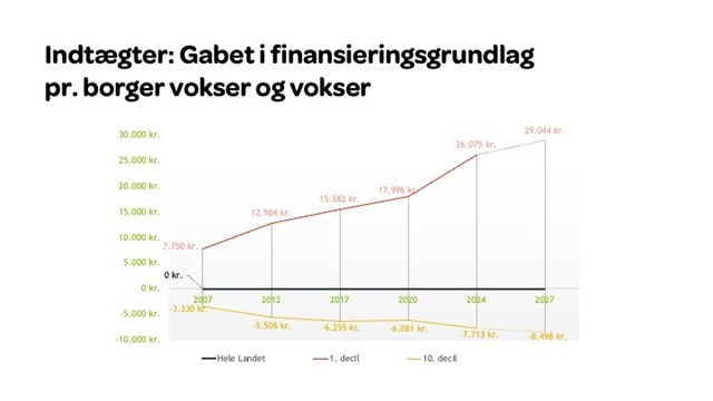 Illustration 2: Gabet mellem kommunerne med højest og lavest finansieringsgrundlag pr. borger udvider sig løbende. Derfor bliver det sværere og sværere for nogle typer af kommuner at tilbyde samme velfærd som en dansk gennemsnitskommune.