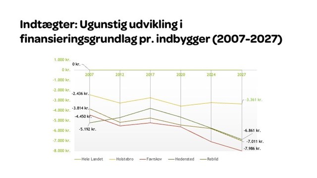 Illustration 1: Graf over udviklingen i finansieringsgrundlaget i Favrskov, Hedensted, Holstebro og Rebild kommuner, som viser at finansieringsgrundlaget i kommunerne bliver forringet over tid.